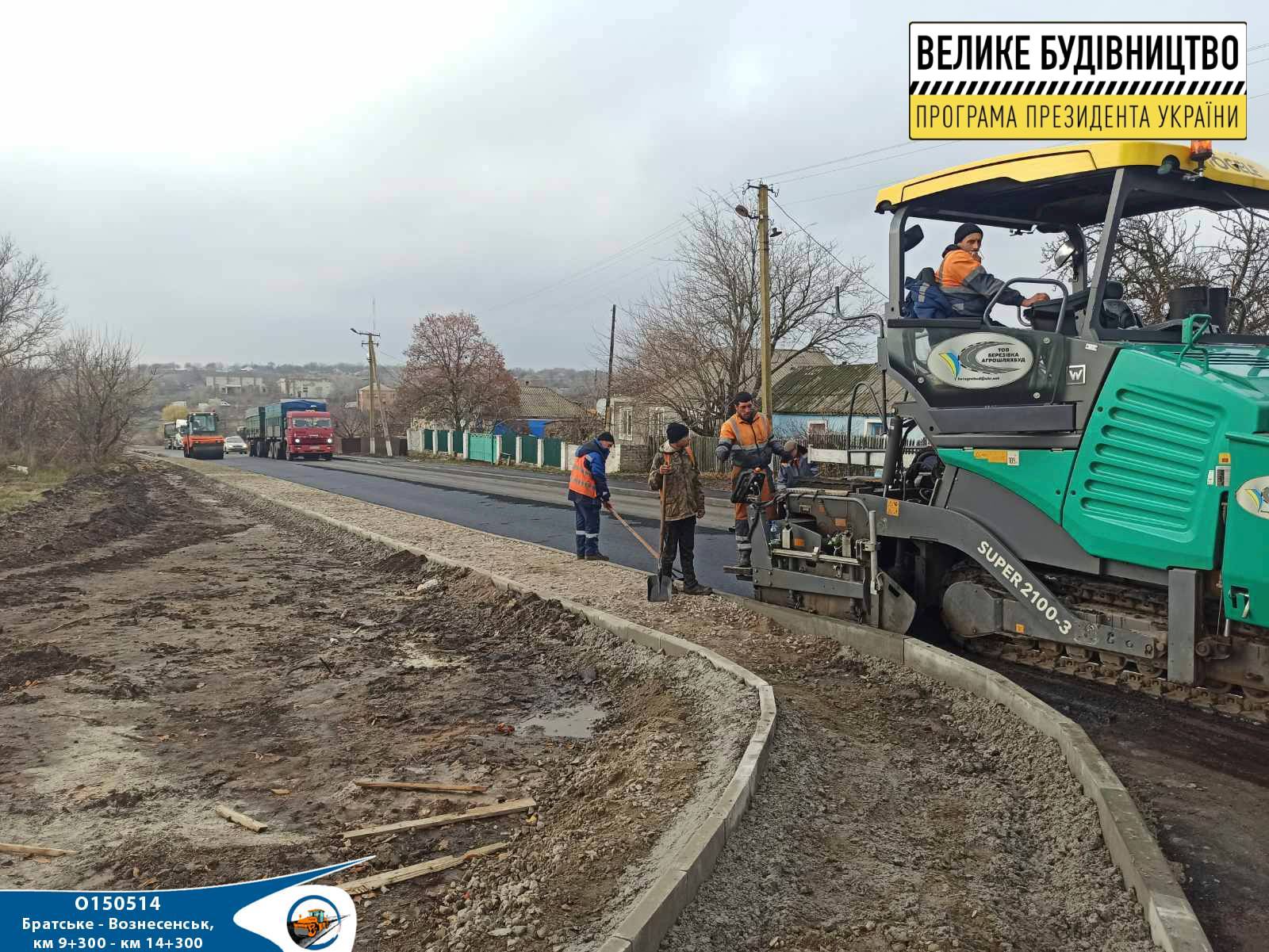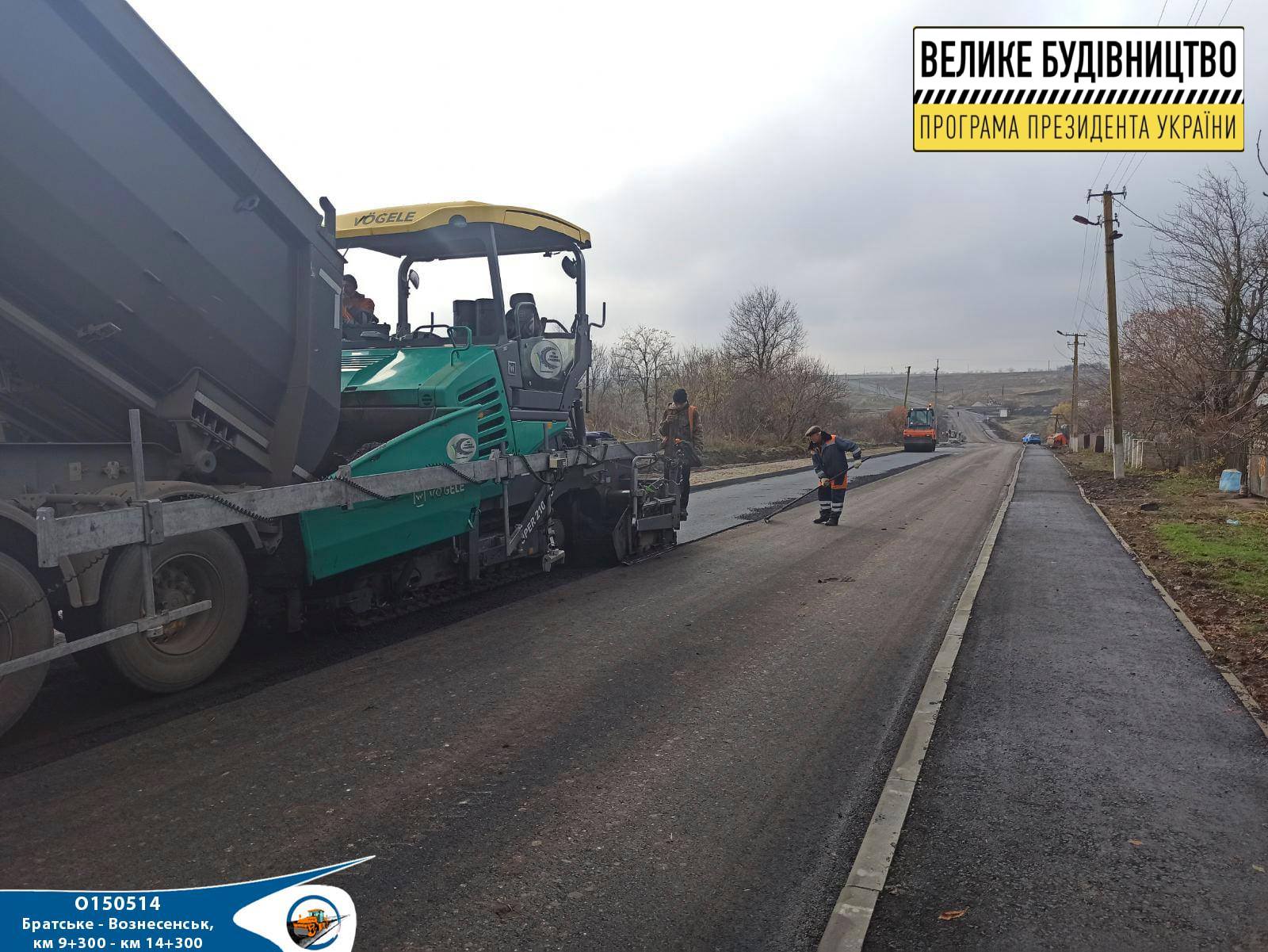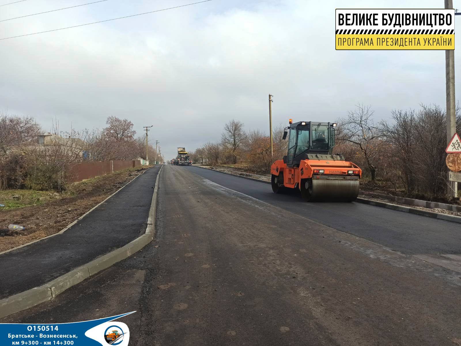 Завдяки програмі Президента України Володимира Зеленського «Велике будівництво» на автомобільній дорозі О150514 Братське – Вознесенськ, км 9+300 - км 14+300, дорожники завершують влаштування верхнього шару асфальтобетону.