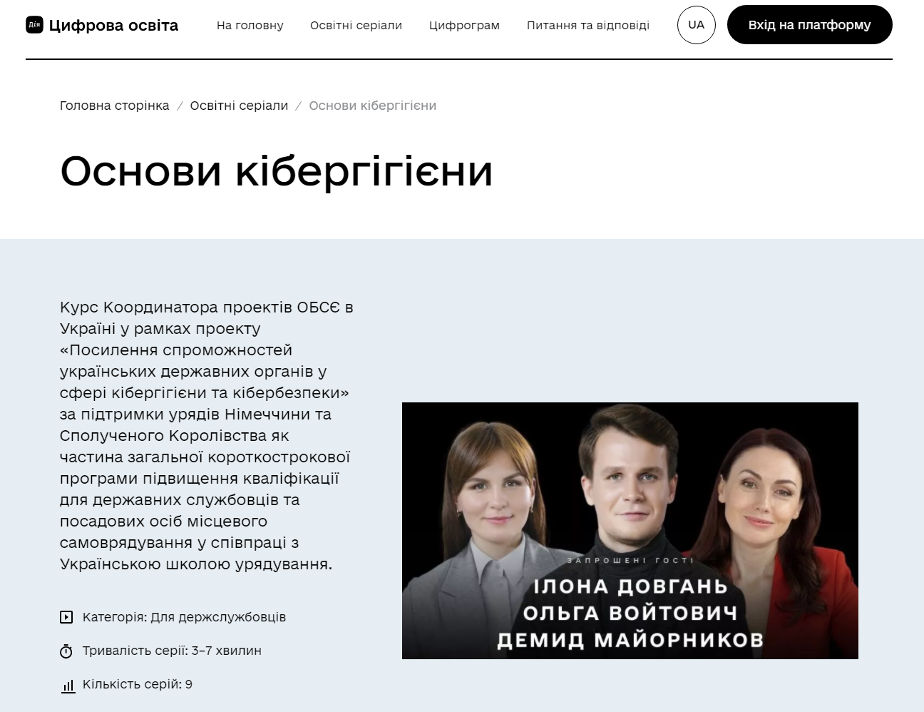 Серіал допоможе засвоїти базові принципи кібергігієни та алгоритми дій у разі виявлення ознак інформаційних атак. Протягом навчання Ви дізнаєтеся за допомогою реальних прикладів, як не стати жертвами зловмисників. Головні загрози, які виникають під час роботи з мобільними пристроями та основні правила безпечної роботи з мобільними пристроями. Розпізнавання фейків в Інтернеті, заходи протидії неправдивим повідомленням.