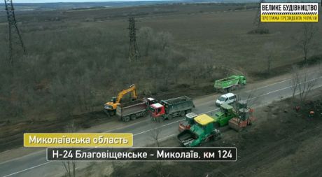 Робітники поетапно розширюють проїзну частину автодороги Н-24, влаштовують дренаж та вирівнюючий шар з крупнозернистої асфальтобетонної суміші.