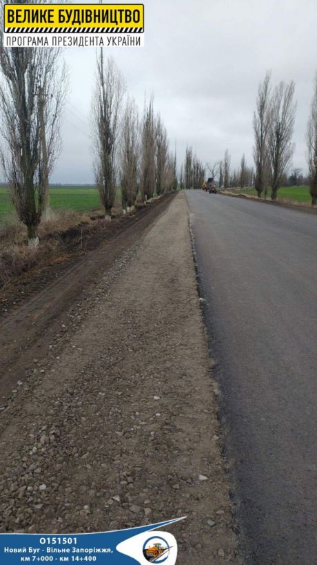 На місцевій дорозі О151501 Новий Буг-Вільне Запоріжжя, км 7+000 - км 14+400 дорожні працівники влаштовують узбіччя із щебенево-піщаної суміші. Роботи планують завершити до кінця поточного року.