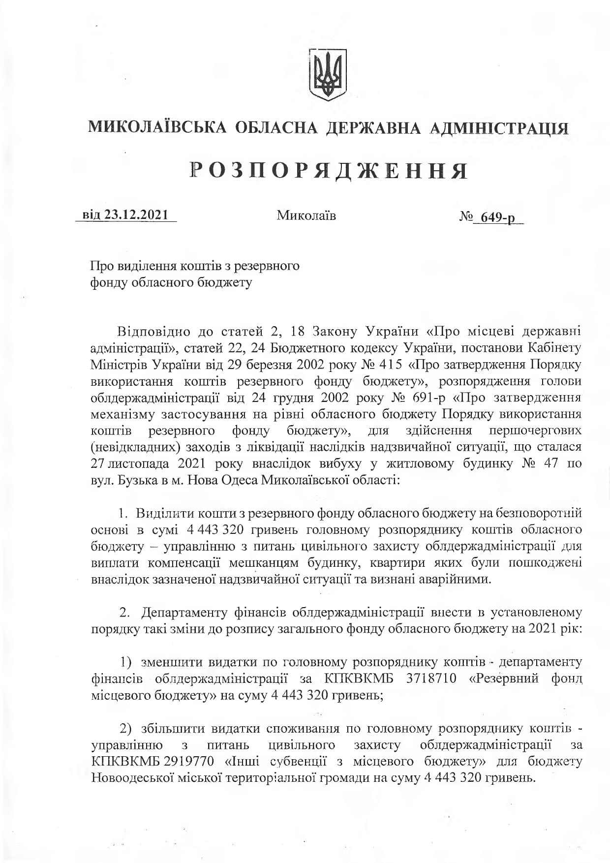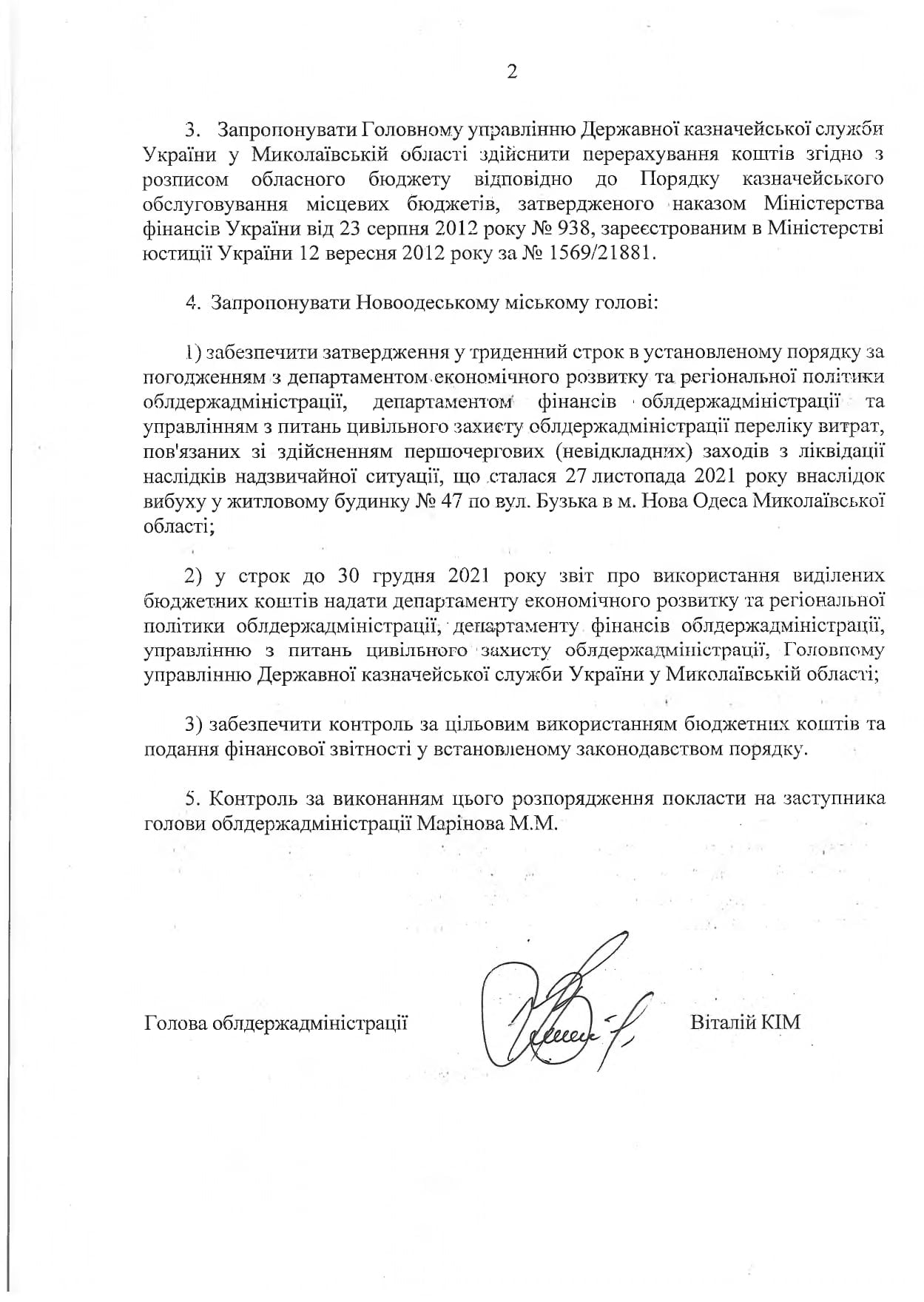Згідно з розпорядженням голови Миколаївської ОДА Віталія Кіма № 649-р від 23.12.2021 «Про виділення коштів з резервного фонду обласного бюджету» на безповоротній основі з резервного фонду виділено 4 443 320 грн для виплати компенсації мешканцям будинку, квартири яких були пошкоджені внаслідок вибуху у житловому будинку в м. Нова Одеса.