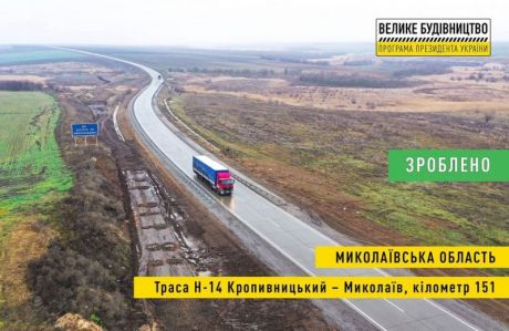 За президентською програмою «Велике будівництво» у Миколаївській області завершився капітальний ремонт траси Н-14 Олександрівка-Кропивницький-Миколаїв. Загальна довжина відремонтованих ділянок складає 74 кілометри.