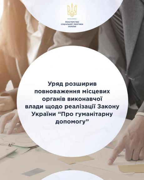 Уряд вніс зміни до Порядку взаємодії центральних і місцевих органів виконавчої влади та Національного банку щодо реалізації Закону України „Про гуманітарну допомогу”, розширивши повноваження місцевих державних адміністрацій для забезпечення оперативності прийняття рішень при наданні гуманітарної допомоги, передавши їм право на прийняття рішень про визнання гуманітарною допомогою вантажів вагою до 5 тонн і вагою до 22 тонн, що складаються з товарів, необхідних для виконання заходів по запобіганню та ліквідації епідемій, інших надзвичайних ситуацій, а також транспортних засобів спеціального та спеціалізованого призначення, що надходять як гуманітарна допомога для територіальних громад.