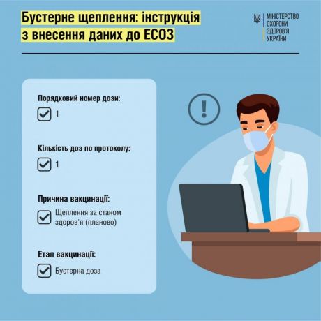 Міністерство охорони здоров'я України нагадує лікарям, яку інформацію потрібно внести в Електронну систему охорони здоров'я, щоб згенерувався COVID-сертифікат на підставі бустерної дози.