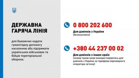 Державна гаряча лінія для бажаючих надати гуманітарну допомогу населенню або підтримати українських військових та бійців територіальної оборони.