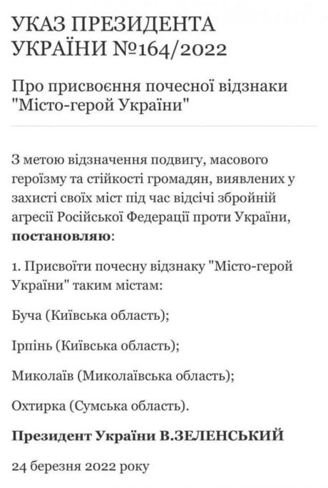 З метою відзначення подвигу, масового героїзму та стійкості громадян, виявлених у захисті своїх міст під час відсічі збройній агресії Російської Федерації проти України Указом Президента України Володимира Зеленського від 24 березня Миколаєву присвоєно почесне звання «Місто-герой України».