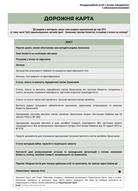 Координаційний штаб з питань поводження з військовополоненими розробив дорожню карту «Дії родини у випадках, якщо член родини зарахований до лав ЗСУ (у тому числі ТрО), правоохоронних органів пропав безвісти, потрапив у полон чи загинув»