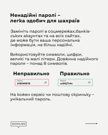 - Замініть паролі в соцмережах, банківських акаунтах та на всіх сайтах, де може бути ваша персональна інформація, на надійніші. Усі паролі рекомендовано змінювати раз на місяць.