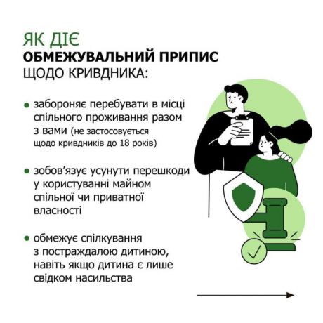Існують такі заходи впливу на кривдників як терміновий заборонний та обмежувальний приписи.