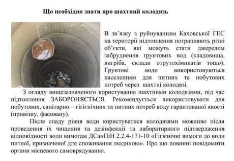 У зв'язку з руйнуванням Каховської ГЕС на території підтоплення потрапляють різні об'єкти, які можуть стати джерелом забруднення ґрунтових вод (кладовища, вигріба, склади отрутохімикатів тощо).