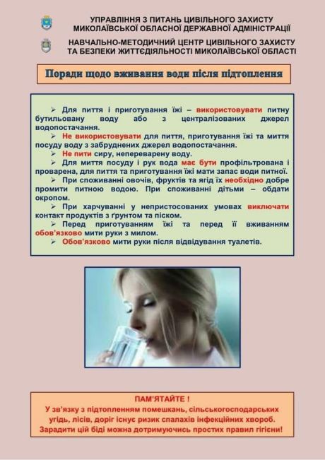 Для пиття і приготування їжі використовувати питну бутильовану воду з централізованих джерел водопостачання.