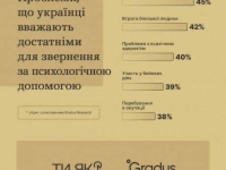 Майже половина українців вважають вагомими причинами для звернення до психолога тільки перебування у полоні (45 %) та втрату близької людини (43 %). Серед інших проблем, достатньо серйозних для отримання допомоги: