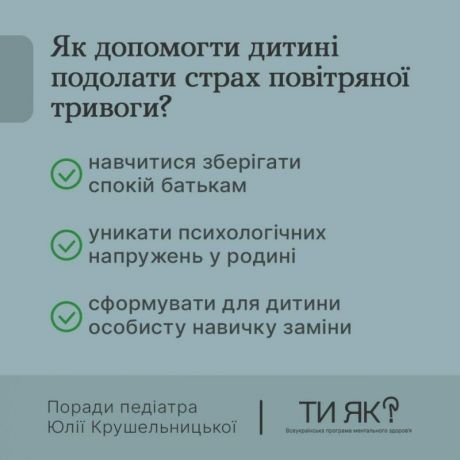 «Зараз до мене часто звертаються люди, які евакуювалися. І кожен четвертий-п’ятий із проблемою дитячого страху. Родини приїжджають із зон активних бойових дій. Відповідно, діти бояться шуму, вибухів, сирен. Знаю випадок, коли дитина ховалася під ліжко щойно вмикалася повітряна тривога. І батьки не знали, як вчинити. Вихід знайшовся у формуванні навички заміни», – зазначила у прямому ефірі на сторінці ГО «Безбар'єрність» та Координаційний центр КМУ / Mental Health UA педіатр Юлія Крушельницька.