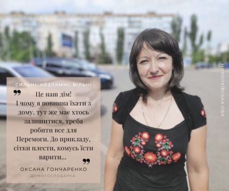 «Це наш дім! І чому я повинна їхати з дому, тут же має хтось залишитися, треба робити все для Перемоги. До прикладу, самій сітки плести, комусь їсти готувати. Наприклад, хлопці з-під Херсона, машина у них зламалась, зупинились. Їм треба допомогти. Я швиденько хлопців знайшла, відтягнули, показали куди треба. Ще і шини знайшли їм!» – говорить Оксана.