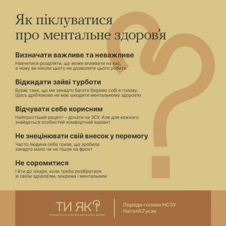 «У нас таке суспільство цікаве. У соцмережах усі наче слідкують за собою. Проходять різні марафони, як краще виглядати, як краще розмовляти, як краще стежити за волоссям, як скинути зайву вагу... Люди схильні довіряти якимось чаклунам замість того, щоб сприймати від фахівців найпростіші поради. У дуже цікавій формі їх зараз достатньо. Вони допомагають сконцентрувати увагу, позбутися страхів, спокійно реагувати на нові виклики та працювати зі своїм ментальним здоров'ям», – зазначила в прямому ефірі на сторінці ГО «Безбар'єрність» та Координаційний центр КМУ / Mental Health UA голова НСЗУ Наталія Гусак.