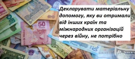 -міжнародних організацій (наприклад, за рахунок коштів Всесвітньої продовольчої програми ООН, Управління Верховного комісара ООН у справах біженців, коштів ЮНІСЕФ, Місії Міжнародного Комітету Червоного Хреста в Україні), її не потрібно декларувати.