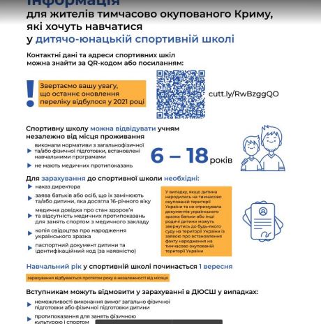 За результатами робочої наради, що відбулася в Міністерстві молоді та спорту України за участю Представництва Президента України в Автономній Республіці Крим, Міністерства з питань реінтеграції тимчасово окупованих територій України та громадської організації «Федерація спортивної боротьби АР Крим», розроблено інфографіку «Інформація для жителів тимчасово окупованого Криму, які хочуть навчатися у дитячо-юнацькій спортивній школі»