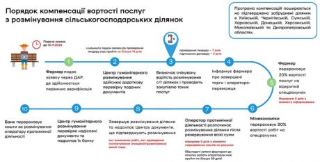 На програму компенсації витрат за гуманітарне розмінування в державному бюджеті на 2024 рік закладено 3 млрд грн. Держава компенсуватиме 80% вартості розмінування ділянки фермерам, які працюють на власній чи орендованій землі. Ціна на послуги з розмінування визначатиметься на відкритих торгах у системі Prozorro. Компенсація надаватиметься лише раз за одну забруднену ділянку.