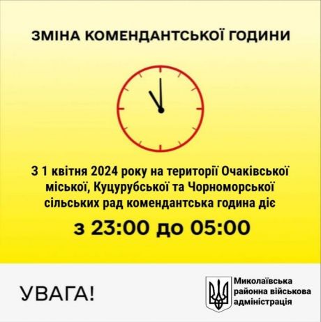 З 01 квітня 2024 року на території Очаківської міської, Куцурубської та Чорноморської сільських територіальних громад встановлено комендантську годину та спеціальний режим світломаскування