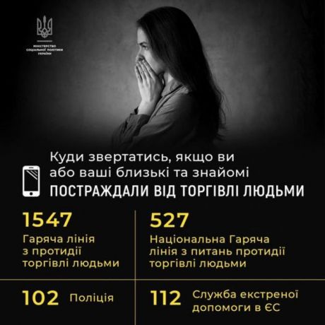 Пам’ятайте, що торгівля людьми ближче, ніж здається. Якщо ви знаєте про випадки торгівлі людьми чи будь-якого виду експлуатації або потерпіли від цього злочину, звертайтеся за номерами: