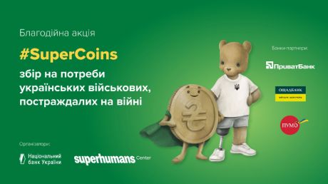 Національний банк України та Superhumans Center запустили щорічну благодійну акцію #SuperCoins. Її мета – зібрати кошти для допомоги українським військовим, які постраждали внаслідок бойових дій. У межах акції по всій країні триватиме збір монет номіналами 10, 50 копійок та 1, 2, 5 і 10 гривень.