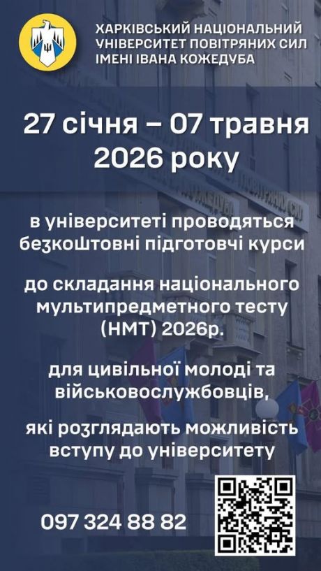 Увага! З 27 січня по 07 травня 2026 року в Харківський національний університет Повітряних Сил імені Івана Кожедуба проводяться БЕЗКОШТОВНІ підготовчі курси для складання НМТ 2026. Курси доступні для цивільної молоді та для військовослужбовців, які розглядають можливість вступу до університету.