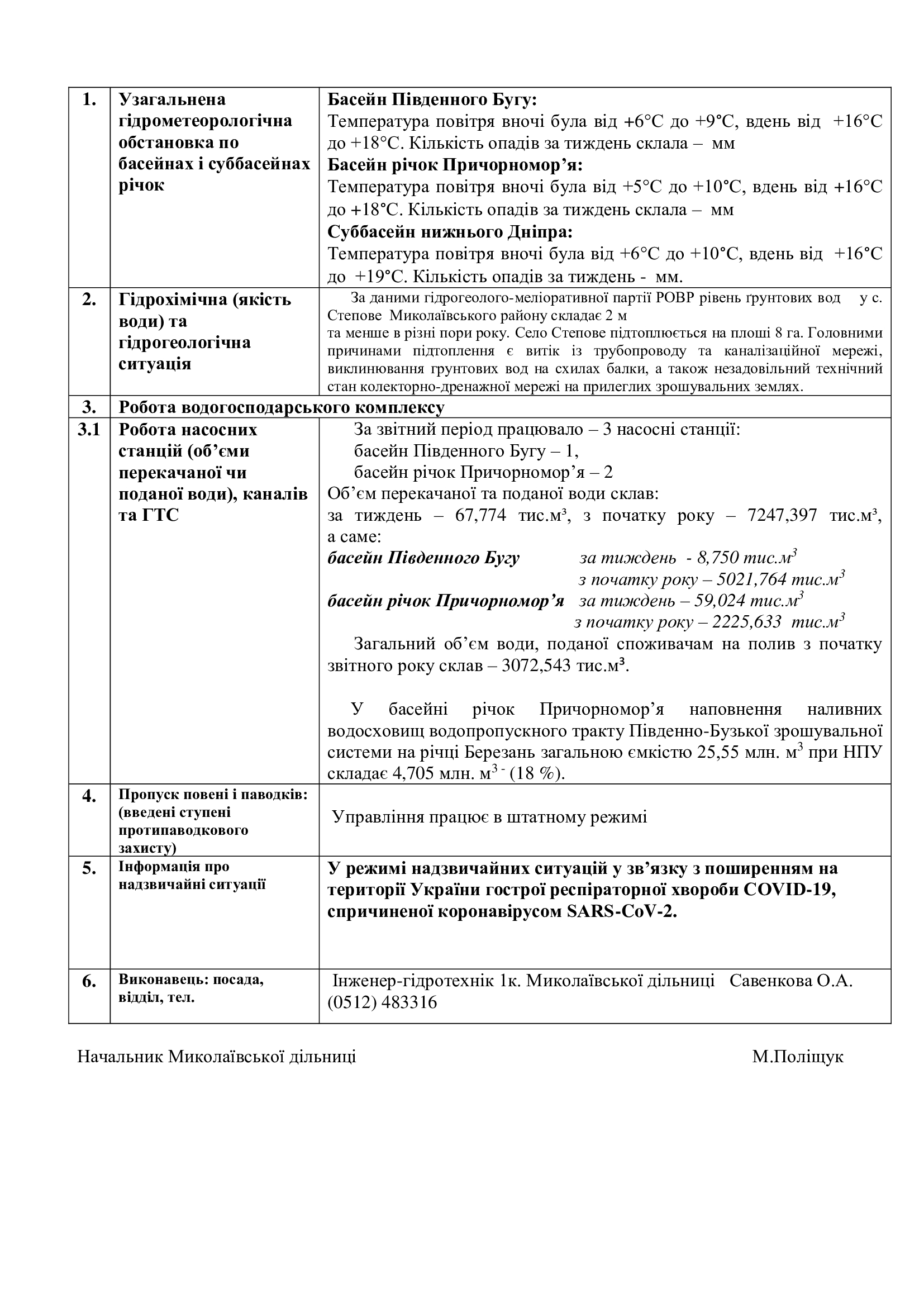 Інформація про водогосподарську обстановку в зоні діяльності Миколаївської дільниці за тиждень