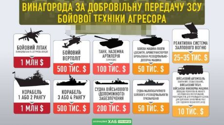 1 квітня 2022 року Верховна Рада ухвалила закон №2172-ІХ “Про встановлення винагороди за добровільну передачу Збройним Силам України придатну для застосування бойову техніку держави-агресора”.