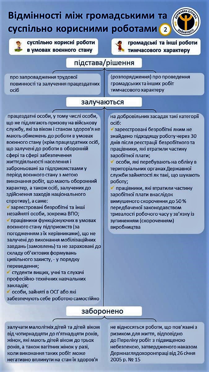На підставі запровадження трудової повинності до суспільно корисних робіт залучаються зареєстровані безробітні та інші незайняті особи, зокрема внутрішньо переміщен,і а також працівники функціонуючих в умовах воєнного стану підприємств, за домовленістю з керівниками.