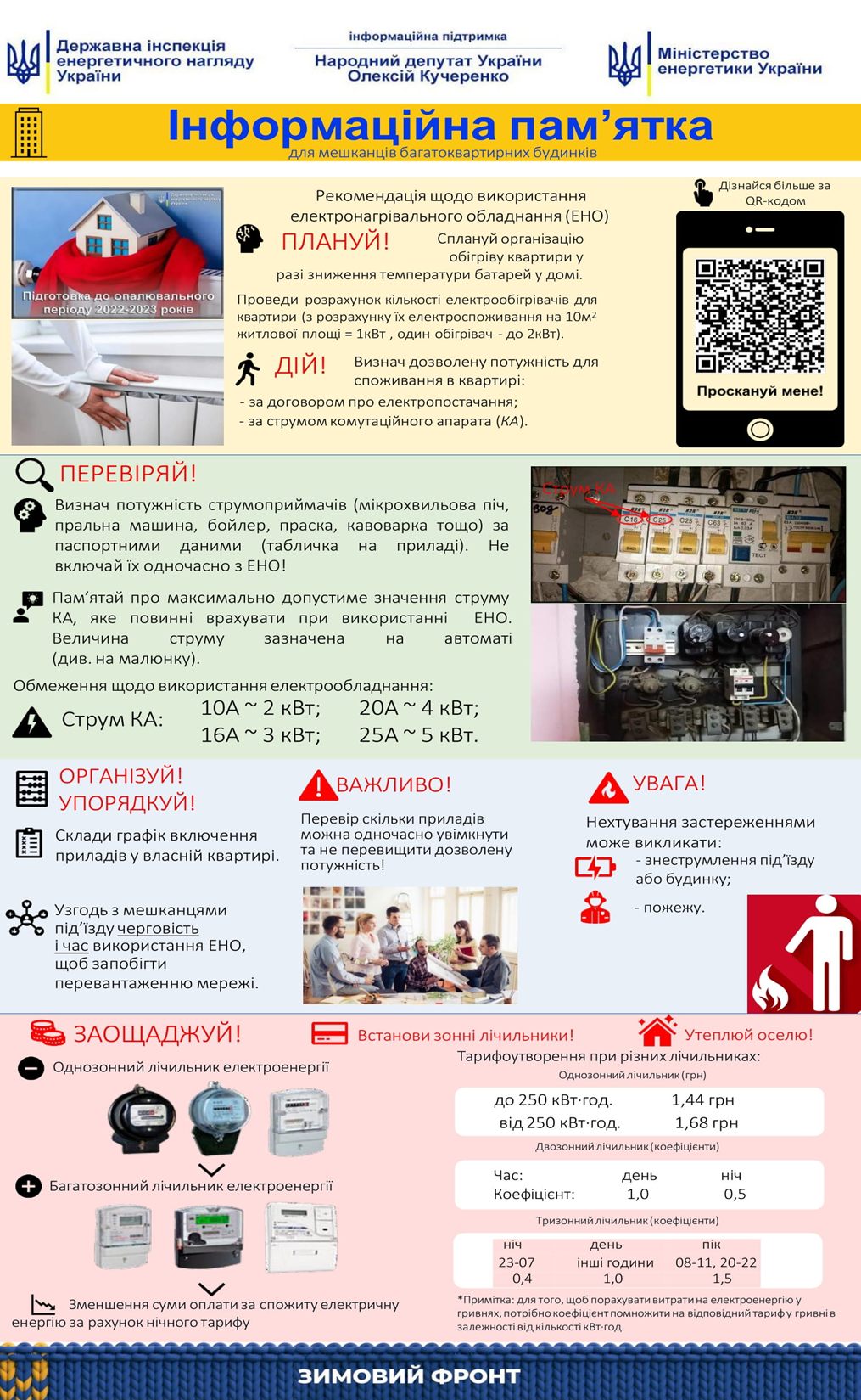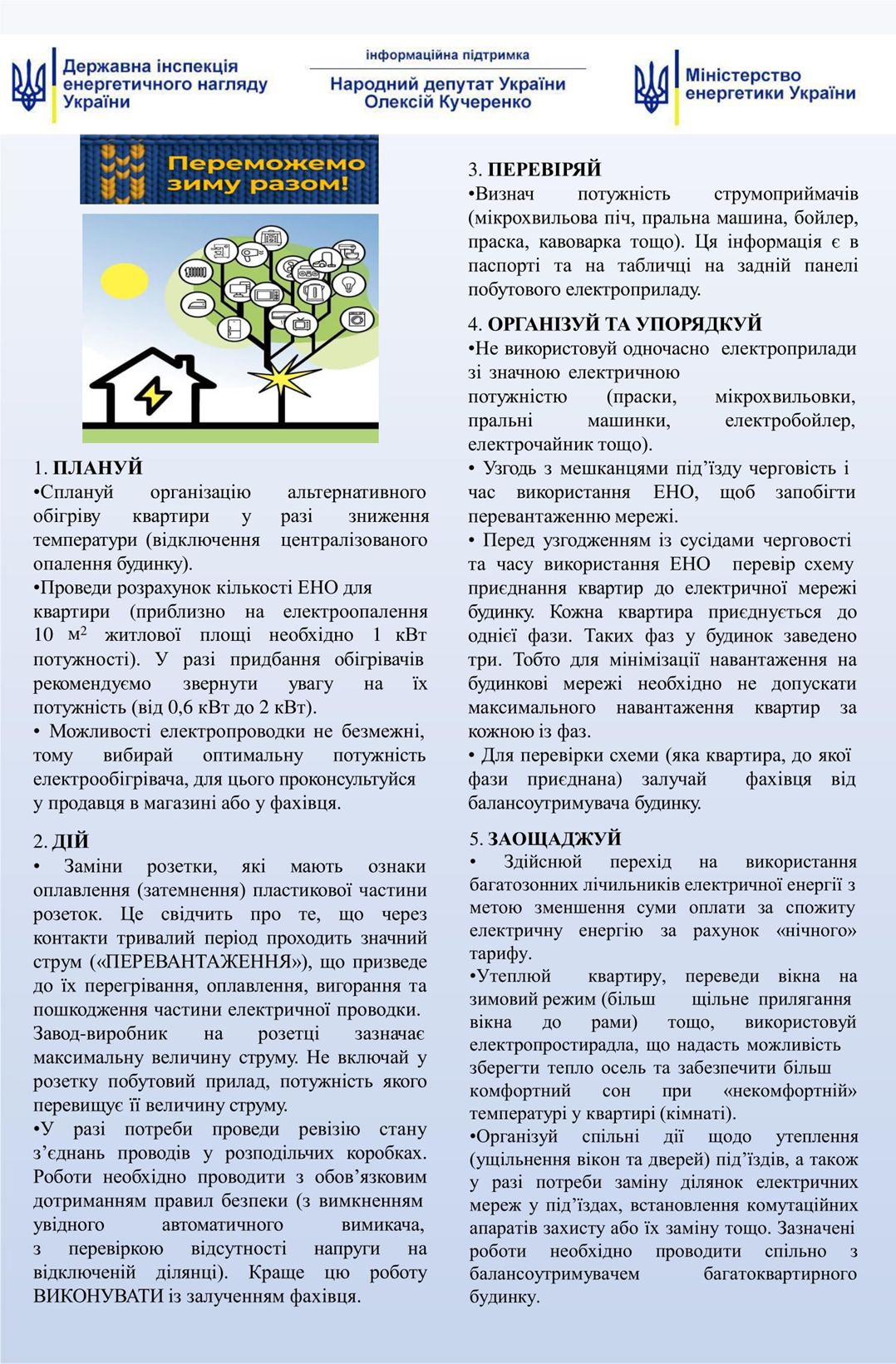 У холодну пору року через масове вмикання обігрівачів та інших опалювальних приладів зростає навантаження на внутрішньобудинкові та розподільчі електромережі. Перенавантаження може вивести з ладу як окреме помешкання, так і цілий багатоквартирний будинок та, навіть, вулицю. Щоб уникнути подібних ситуацій Держенергонаглядом підготовлено Інформаційну пам’ятку –для мешканців багатоквартирних будинків. У ній можна дізнатися як підготувати свою оселю до ОП та як уникнути перевантаження електромереж у зимову пору року.