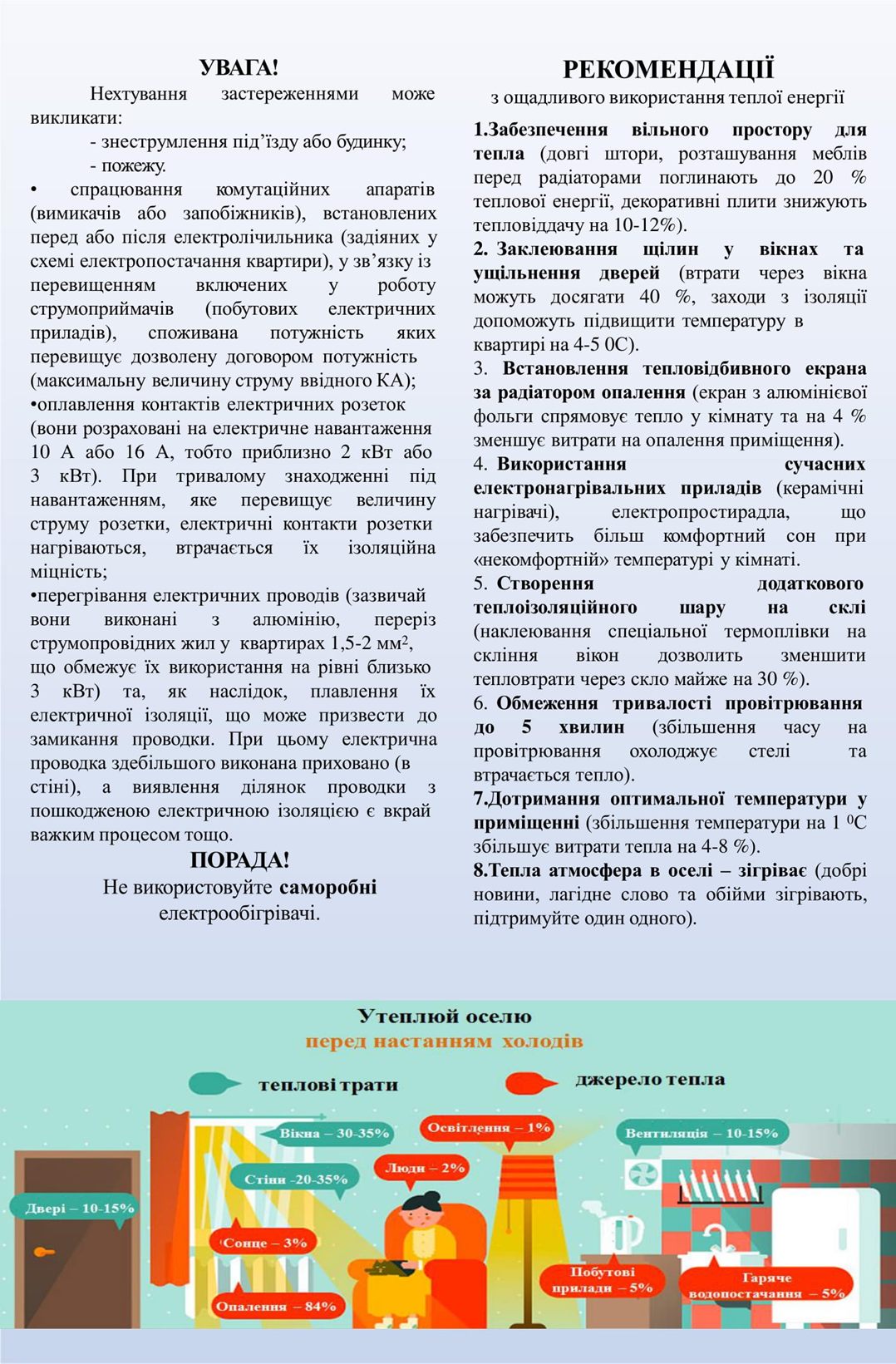• зверніть увагу на правильність використання електроприладів, якими ви користуєтесь у своїх домоволодіннях (в тому числі опалювальних) у межах дозволеної вам потужності;