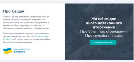 https://www.svidok.org/) – це безпечний щоденник війни, в якому українці можуть анонімно зберігати свої спогади, роздуми, спостереження та увесь свій досвід життя протягом агресивного російського вторгнення в Україну. А також документувати докази свавілля та злочинів, вчинених російською владою та військовими.