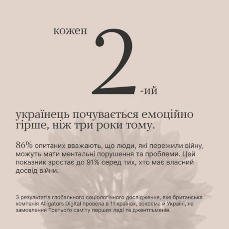 На замовлення третього Саміту перших леді та джентльменів британська компанія Alligators Digital провела глобальне соціологічне дослідження серед жителів 11 країн. Відповіді дозволили частково описати, як сприймають ментальне здоров’я в Україні та світі.