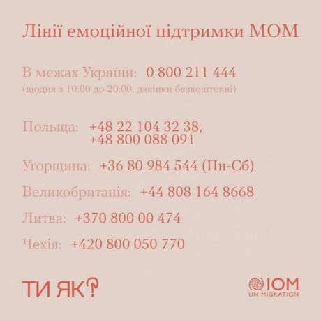 Лінія емоційної підтримки Міжнародної організації з міграції (МОМ) — це безоплатна та анонімна допомога кваліфікованих психологів, які готові вислухати вас при будь-яких запитах для покращення емоційного стану.