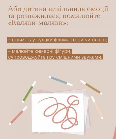 Коли дитина закінчить, роздивіться разом її малюнок. Пофантазуйте, пошукайте там чудернацьких тварин, смішних прибульців. Якщо потрібно щось домалювати (вуха чи хвости), супроводжуйте цей процес кумедними звуками.