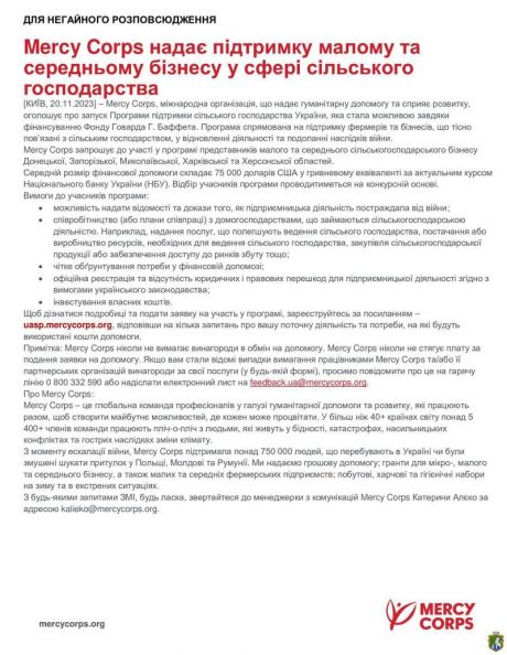 Mercy Corps запрошує місцеве населення та внутрішньо переміщенних осіб (ВПО), які потребують допомоги у відновленні сільськогосподарської діяльності, що була втрачена або постраждала внаслідок війни у Донецькій, Запорізькій, Миколаївській, Харківській та Херсонській областях