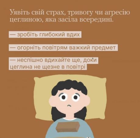 Уявіть свої переживання важким предметом. Наприклад, цеглиною. Вона лежить десь у грудях і викликає дискомфорт — робить вас неповороткими, заважає дихати. Щоб позбутися цеглини: