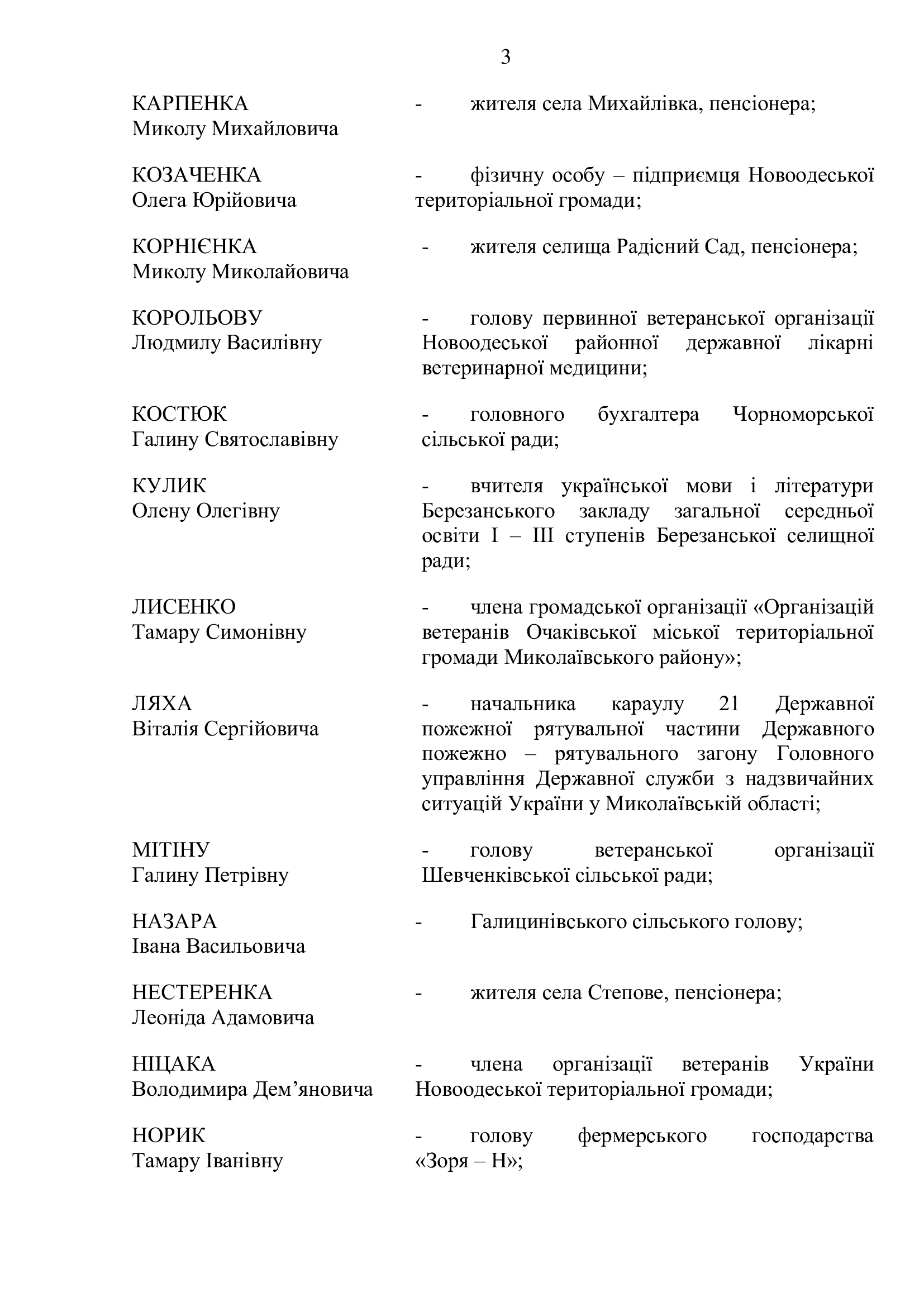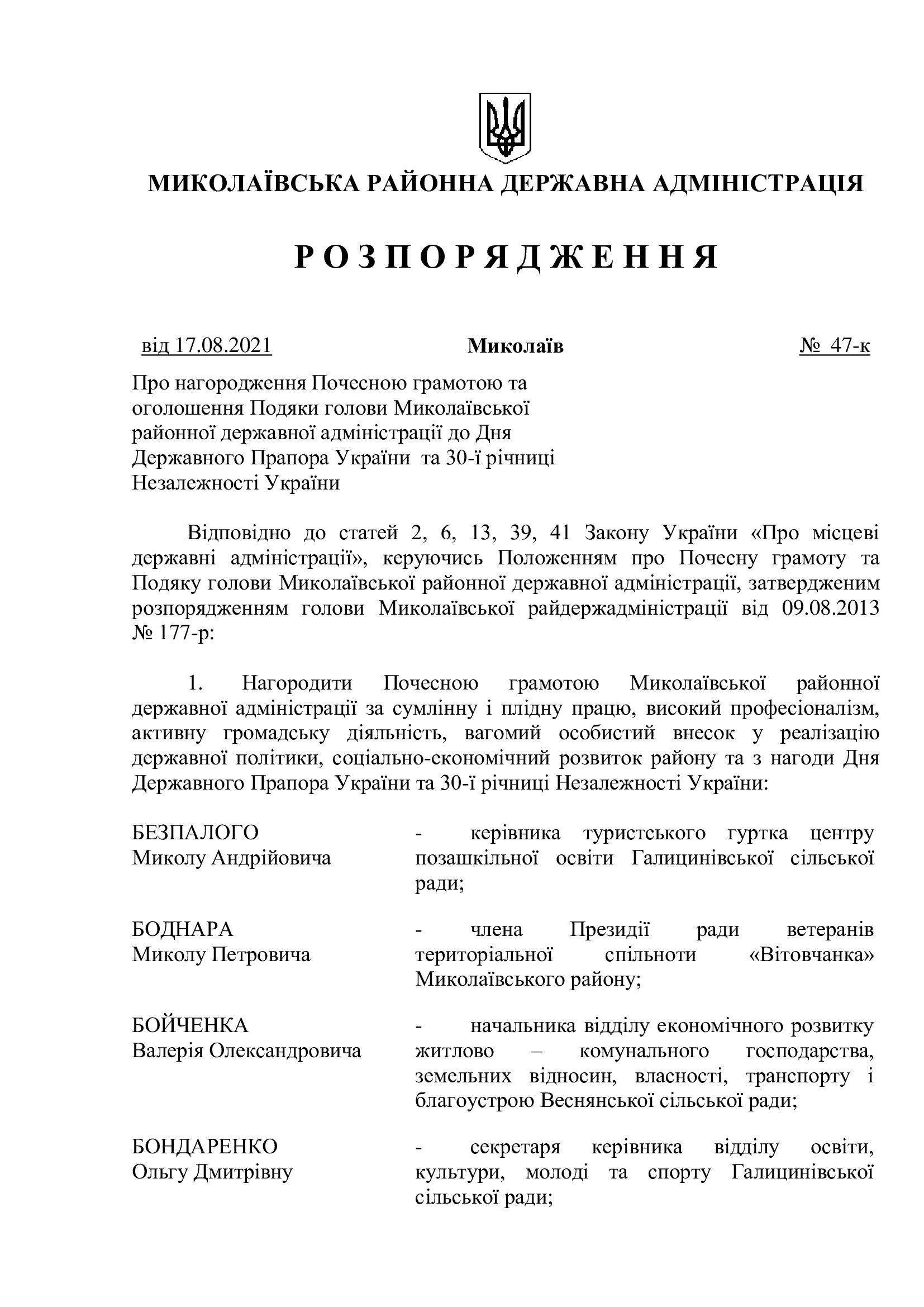 Персоналії Миколаївського району, які внесли вклад у розбудову незалежної України та нагородженні Почесною грамотою і Подякою голови Миколаївської районної державної адміністрації до Дня Державного Прапора України та 30-ї річниці Незалежності України .