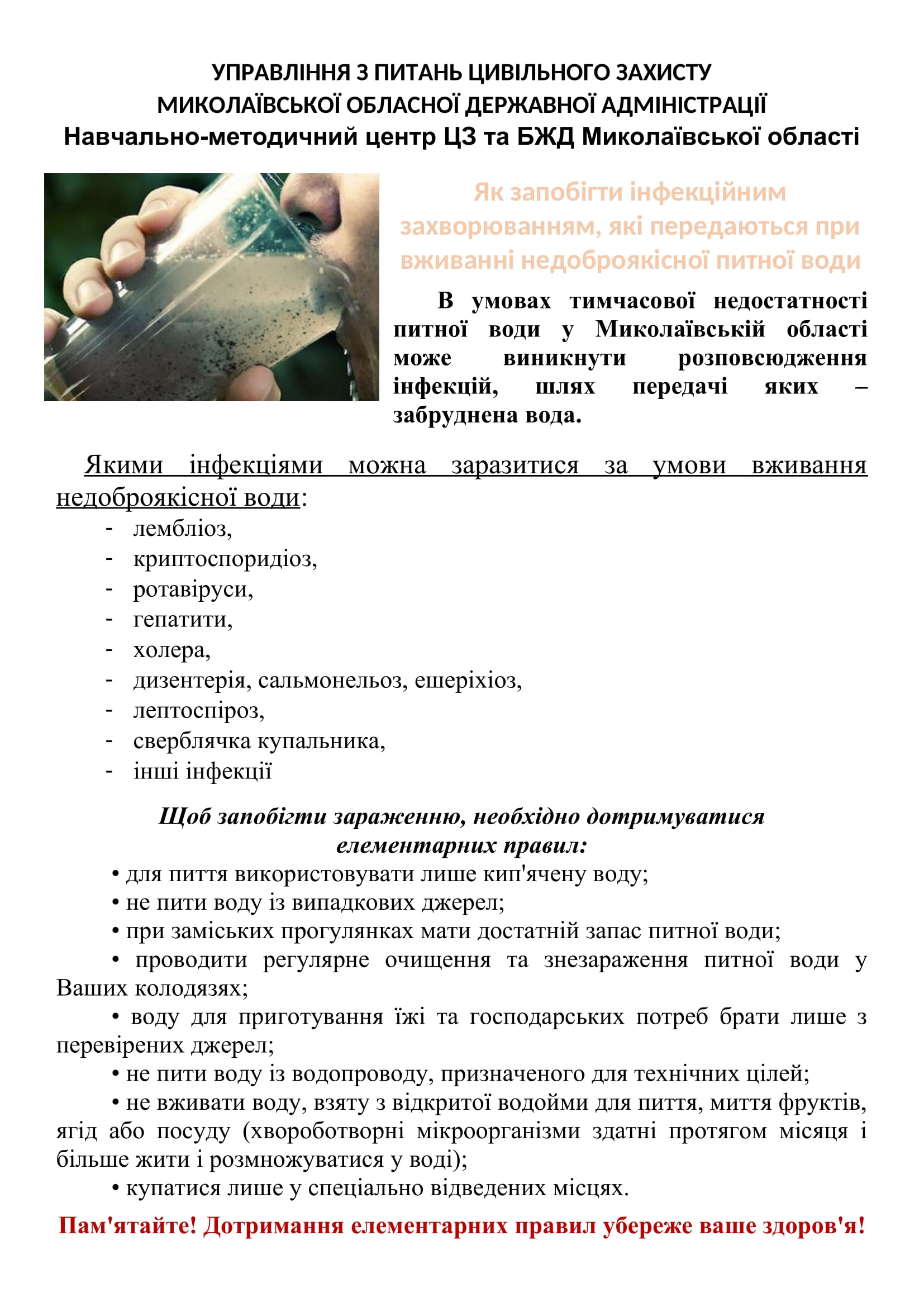 В зв’язку з цим, Головне управління Держпродспоживслужби, з метою запобігання виникнення інфекційних захворювань та хімічних отруєнь внаслідок вживання забрудненої води, пропонує ретельно придержуватися наступних правил:
