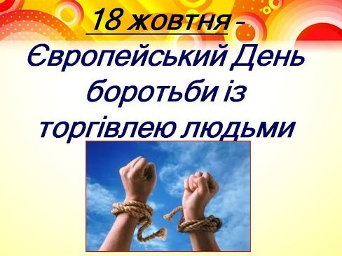 Щорічно 18 жовтня відзначається Європейський день боротьби з торгівлею людьми. Нагадуємо, що відповідно до Закону України «Про протидію торгівлі людьми», торгівля людьми – це здійснення незаконної угоди, об’єктом якої є людина, а так само вербування, переміщення, переховування, передача або одержання людини, вчинені з метою експлуатації, у тому числі сексуальної, з використанням обману, шахрайства, шантажу, уразливого стану людини або із застосуванням чи погрозою застосування насильства, з використанням службового становища або матеріальної чи іншої залежності від іншої особи, що відповідно до Кримінального кодексу України визнаються злочином.