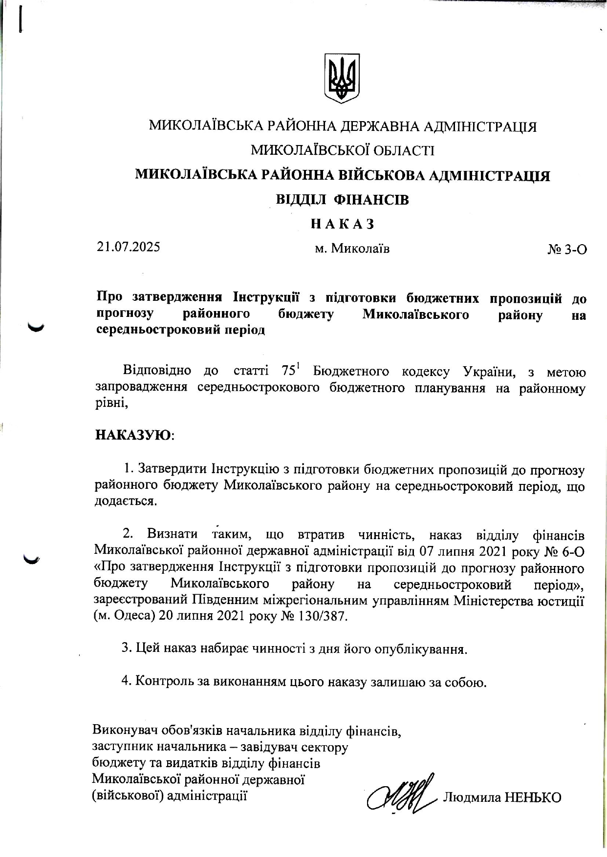 Наказ відділу фінансів Миколаївської районної державної (військової) адміністрації Миколаївської області від 21 липня 2025 року № 3-О "Про затвердження Інструкції з підготовки бюджетних пропозицій до прогнозу районного бюджету Миколаївського району на середньостроковий період", зареєстрований Південним міжрегіональним управлінням Міністерства юстиції (м. Одесса) 30 липня 2025 року за № 226/1230.