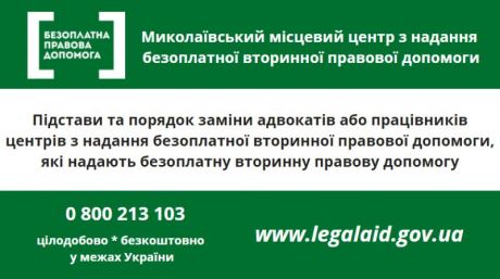 Отримати консультацію з правових питань можна у Миколаївському місцевому центрі з надання безоплатної вторинної правової допомоги, який працює за адресою: 54056, м. Миколаїв, вул. Космонавтів, 61, тел. (0512) 44-54-60, 44-54-61