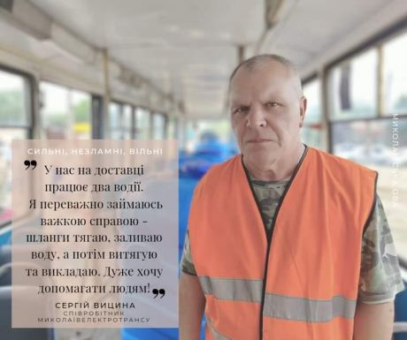 Сергій Вицина має 20 річний досвід керування трамваєм. У квітні минулого року, коли Миколаїв через обстріли залишився без централізованого водопостачання, разом з колегою почав розвозити очищену воду містом.