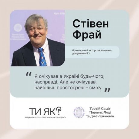 Британський актор, письменник і документаліст Стівен Фрай, який став гостем і ведучим третього Summit of First Ladies and Gentlemen, присвяченого ментальному здоров’ю, зізнався: дорогою до Києва багато думав, якими будуть його відчуття в українській столиці. Але найбільші враження отримав навіть не від того, що першої ж ночі довелося спати у готельному бомбосховищі.