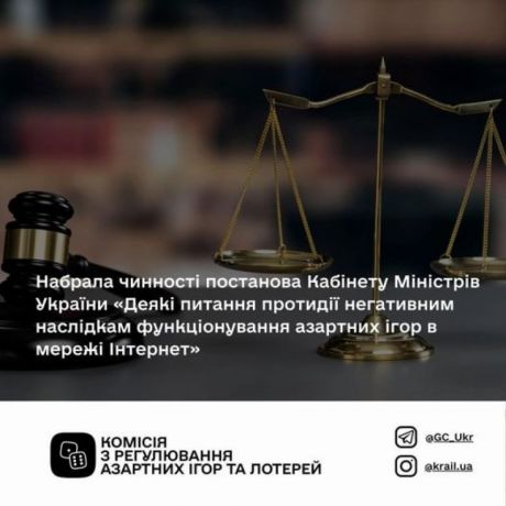 Комісія з регулювання азартних ігор та лотерей повідомляє, що 21 травня 2024 року набрала чинності постанова Кабінету Міністрів України № 566 «Деякі питання протидії негативним наслідкам функціонування азартних ігор в мережі Інтернет», якою, зокрема, з 21 травня 2024 року запроваджуються: