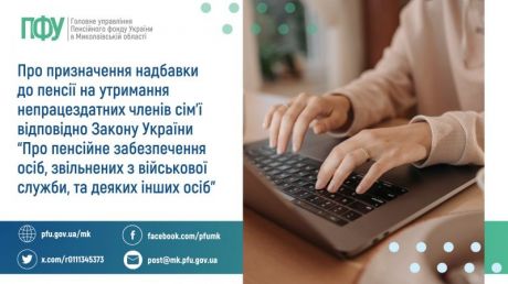 Відповідно до пунктів "а" статей 16 та 24 Закону України "Про пенсійне забезпечення осіб, звільнених з військової служби, та деяких інших осіб" (далі – Закон) до пенсії за вислугу років та по інвалідності, що призначається особам офіцерського складу, прапорщикам і мічманам, військовослужбовцям надстрокової служби та військової служби за контрактом, особам, які мають право на пенсію за цим Законом, нараховується надбавка непрацюючим пенсіонерам, які мають на своєму утриманні непрацездатних членів сім'ї, що належать до осіб, які забезпечуються пенсією в разі втрати годувальника (стаття 30), – на кожного непрацездатного члена сім'ї в розмірі 50 процентів прожиткового мінімуму для осіб, які втратили працездатність.
