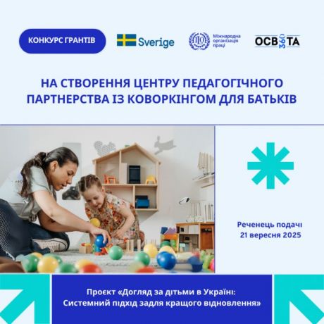 ГО «Освіта 360», у партнерстві з Міжнародною організацією праці (МОП) та за підтримки Шведського агентства міжнародного розвитку (Sida), оголошує конкурс на створення пілотних центрів педагогічного партнерства із коворкінгами для батьків у семи областях України: Одеській, Миколаївській, Дніпропетровській, Запорізькій, Харківській, Сумській та Чернігівській.