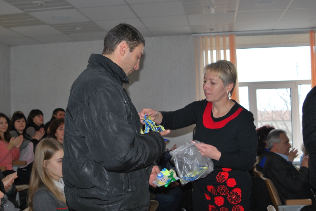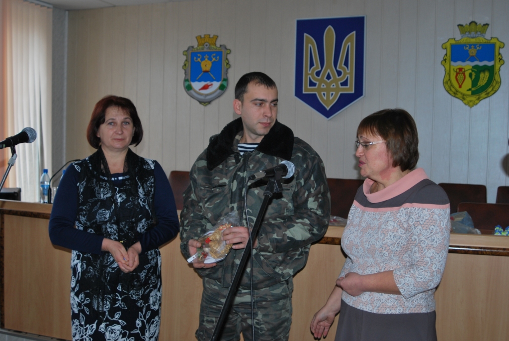 Воїни-учасники антитерористичної операції отримали від голови райдержадміністрації Воробйової А.В., вдови загиблого воїна Голубовської Л.Г., учнівської молоді обереги та вітальні листівки (в їх виготовленні брали участь загальноосвітні школи Миколаївського району).