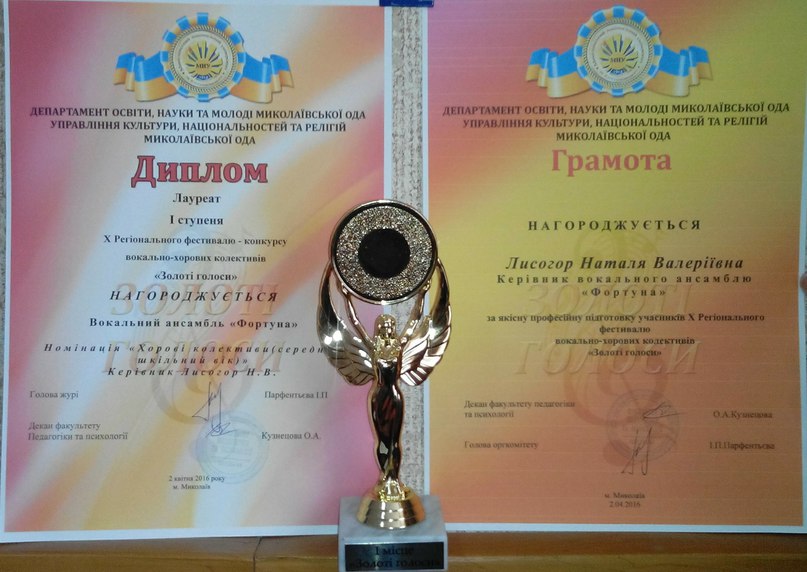 Вокальний ансамбль «Фортуна» отримали Диплом I ступеню у номінації «Хорові колективи», пам’ятний кубок та за якісну професійну підготовку колективу було нагороджено грамотою керівник вокального ансамблю – Наталя Лисогор.