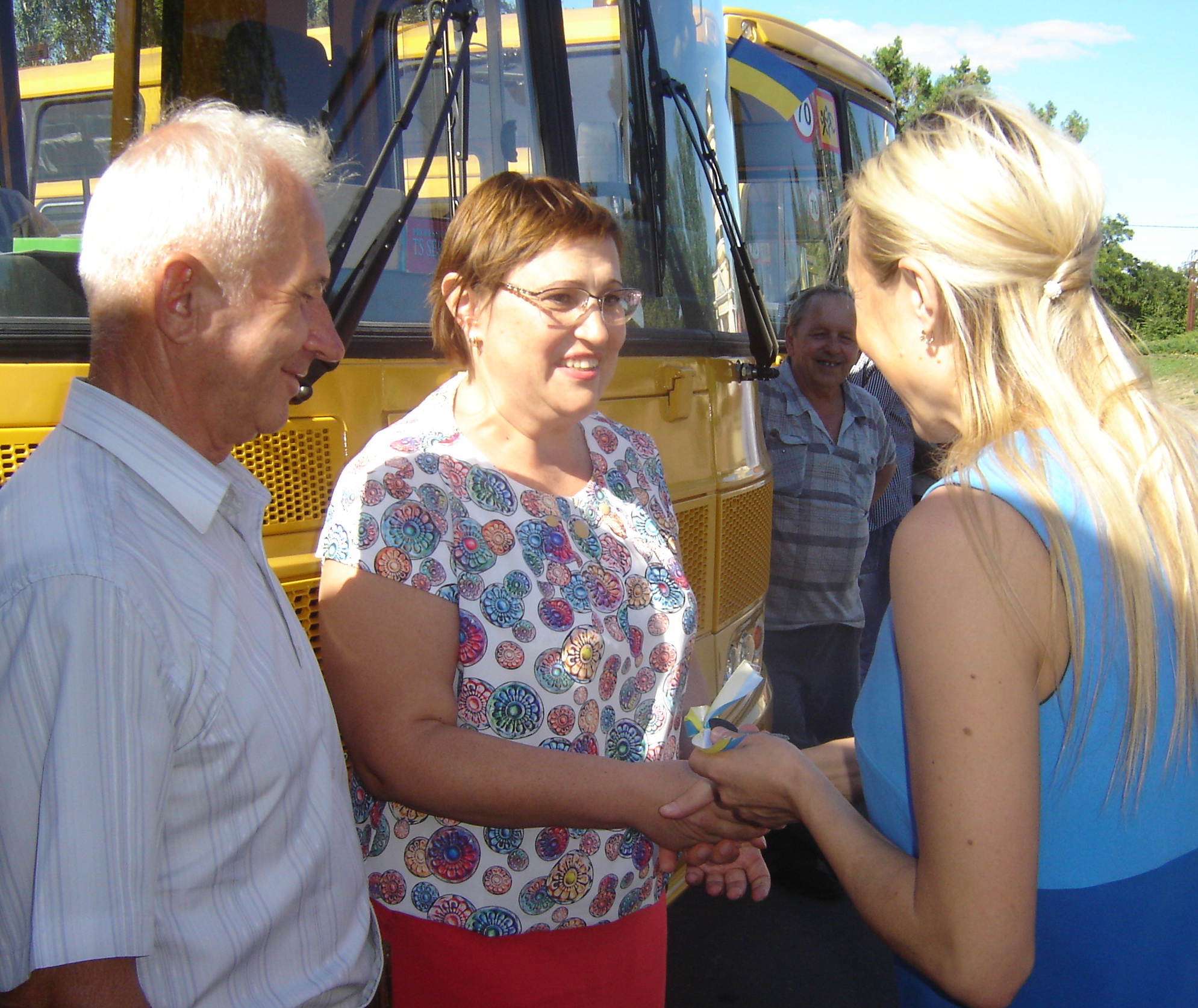 31 серпня документи на транспортні засоби та ключі в урочистій обстановці т. в. о. голови облдержадміністрації В’ячеслав Бонь, голова обласної ради Вікторія Москаленко передали представникам районів - нашого - голові райдержадміністрації Аллі Воробйовій, першому заступнику голови РДА Олексію Бродецькому, в. о. начальника відділу освіти РДА Марії Колесниченко, директору Кир’яківської ЗОШ І-ІІІ ступенів Леоніду Торопенку.